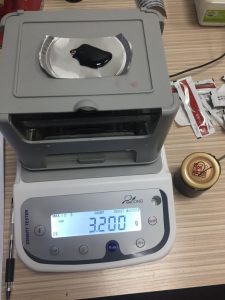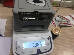 • 將2號(hào)阿膠膏體液置于稱重臺(tái)上,屏幕出現(xiàn)空氣中阿膠液的重量為3.365,按MODE鍵,就記錄了阿膠液在空氣中的重量了。
