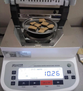 測試樣品:剪取2克紙皮,置于不銹鋼托盤中,將紙皮平鋪均勻,溫度設置120℃用儀器進行加熱,約5分鐘后檢測結束,檢測數(shù)據(jù)顯示10.26%;