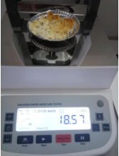 - 為了得到更精確穩(wěn)定的數(shù)據(jù)結(jié)果,在進(jìn)行第二次測(cè)試過程前先等待面包水分儀降溫,待儀器本身溫度降至40度以下時(shí),同樣取5克面包碎屑于不銹鋼托盤中,將面包碎屑平鋪均勻,這次我們把溫度設(shè)定在120℃,按“START”鍵開始測(cè)試,5分26秒后檢測(cè)結(jié)束,檢測(cè)數(shù)據(jù)顯示18.34%;