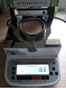 一、測試咖啡:為了使測試過程中咖啡水分儀將咖啡烘干烘透,我們將咖啡分散開來,以便溫度能滲透進(jìn)咖啡內(nèi)部。取5克咖啡撒于不銹鋼托盤中,用鑷子將咖啡平鋪均勻,為避免咖啡經(jīng)過高溫度加熱后變性,我們將溫度設(shè)置在105℃,按“START”鍵開始測試,5分44秒后檢測結(jié)束,檢測數(shù)據(jù)顯示1.66%;