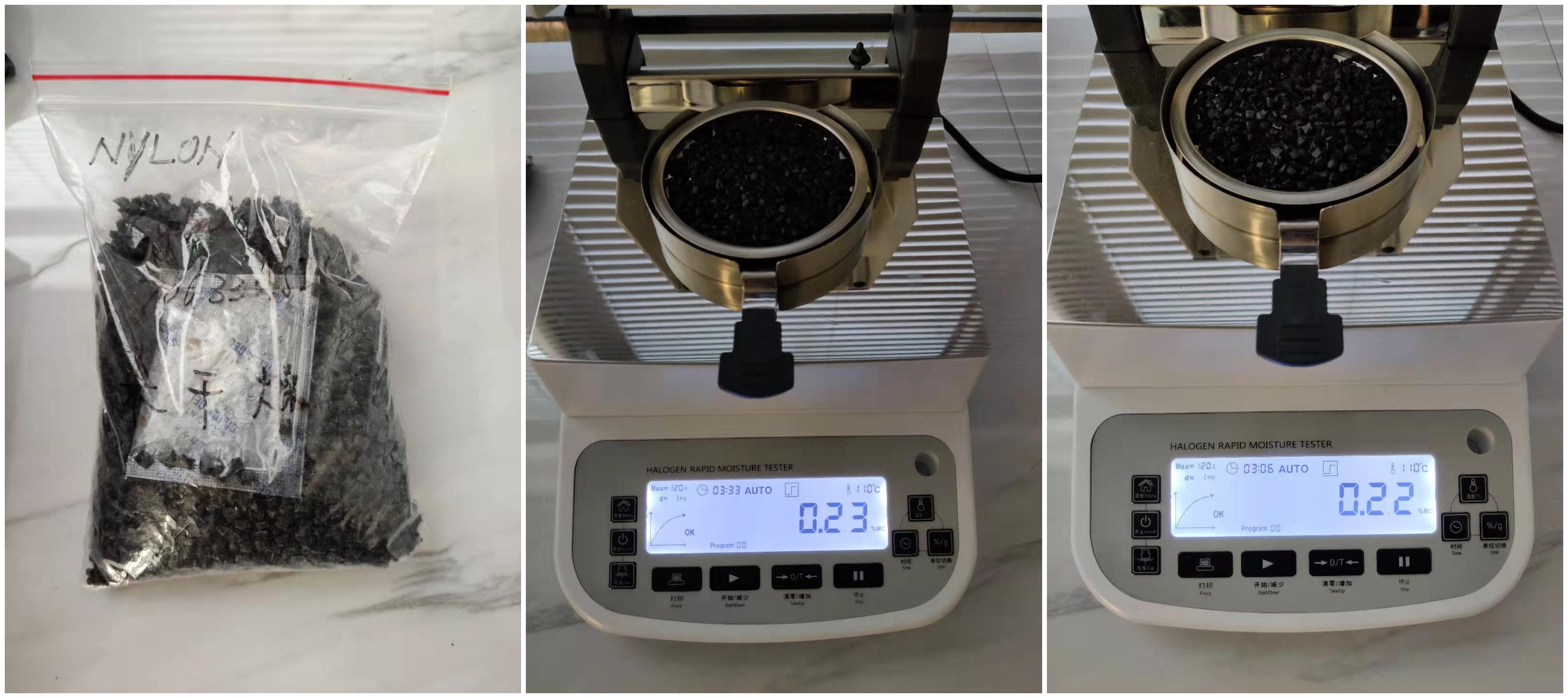 5. 重復步驟3/4,測試未烘干的尼龍顆粒水分分別為0.23%、0.22%。