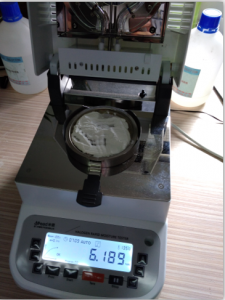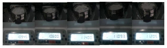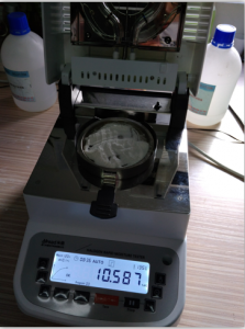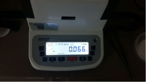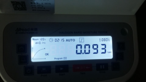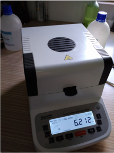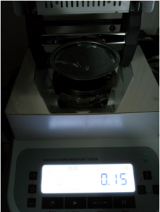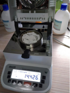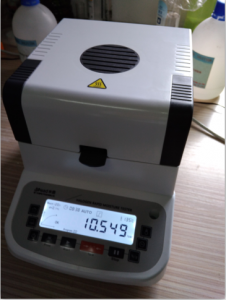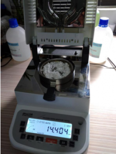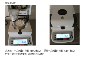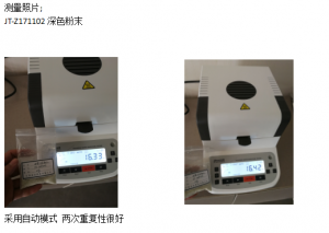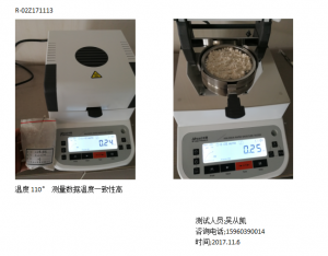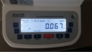 1、測(cè)試陶瓷粉末:為了使測(cè)試過(guò)程中將陶瓷粉末烘干烘透,我們將陶瓷粉末分散開(kāi)來(lái),以便溫度能滲透進(jìn)陶瓷粉末內(nèi)部。取8克多陶瓷粉末撒于不銹鋼托盤中,用鑷子將陶瓷粉末平鋪均勻,為使陶瓷粉末經(jīng)過(guò)高溫度加熱后能夠徹底烘干,我們將溫度設(shè)置在105℃,按“START”鍵開(kāi)始測(cè)試,1分鐘37秒后檢測(cè)結(jié)束,檢測(cè)數(shù)據(jù)顯示0.30%;