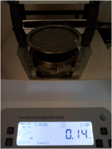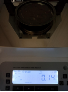 2、為了得到更精確穩(wěn)定的數(shù)據(jù)結(jié)果,在進(jìn)行第二次測(cè)試過(guò)程前先等待陶瓷粉末水分儀降溫,待水分儀本身冷卻至40度以下時(shí),這次我們一樣取8克多陶瓷粉末,將陶瓷粉末平鋪均勻,這次我們把溫度依然控制在105℃,這次我們采用自動(dòng)測(cè)試模式。按“START”鍵開(kāi)始測(cè)試,1分41秒后檢測(cè)結(jié)束,檢測(cè)數(shù)據(jù)顯示0.29%;