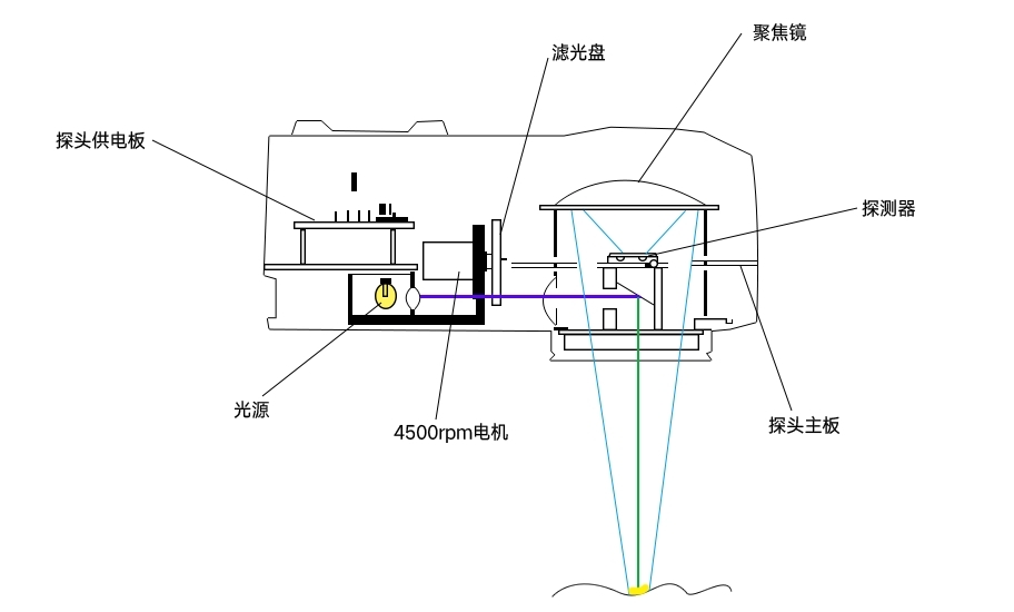 在線紅外水分測(cè)量?jī)x使用裝嵌在轉(zhuǎn)輪上的精密紅外濾光片。這種安裝允許參照光和測(cè)量光的脈沖交替地通過濾光片。被保留的光束會(huì)被聚焦在受測(cè)試的樣品上。首先是參照光被投影在樣品上,然后是測(cè)量光被投影在樣品上。這兩個(gè)具有時(shí)序的光能脈沖會(huì)被反射回到一個(gè)探測(cè)器上,依次轉(zhuǎn)換成兩個(gè)電信號(hào)。參考通道表示預(yù)計(jì)的反射能量的多少。測(cè)量通道有一部分被水分子所吸收,因此其能量將出現(xiàn)衰減。這兩個(gè)信號(hào)結(jié)合形成一個(gè)比率。這比率與一些從不同含水程度樣品中獲得的其它比率的差,是與兩者含水量的差成正比例。